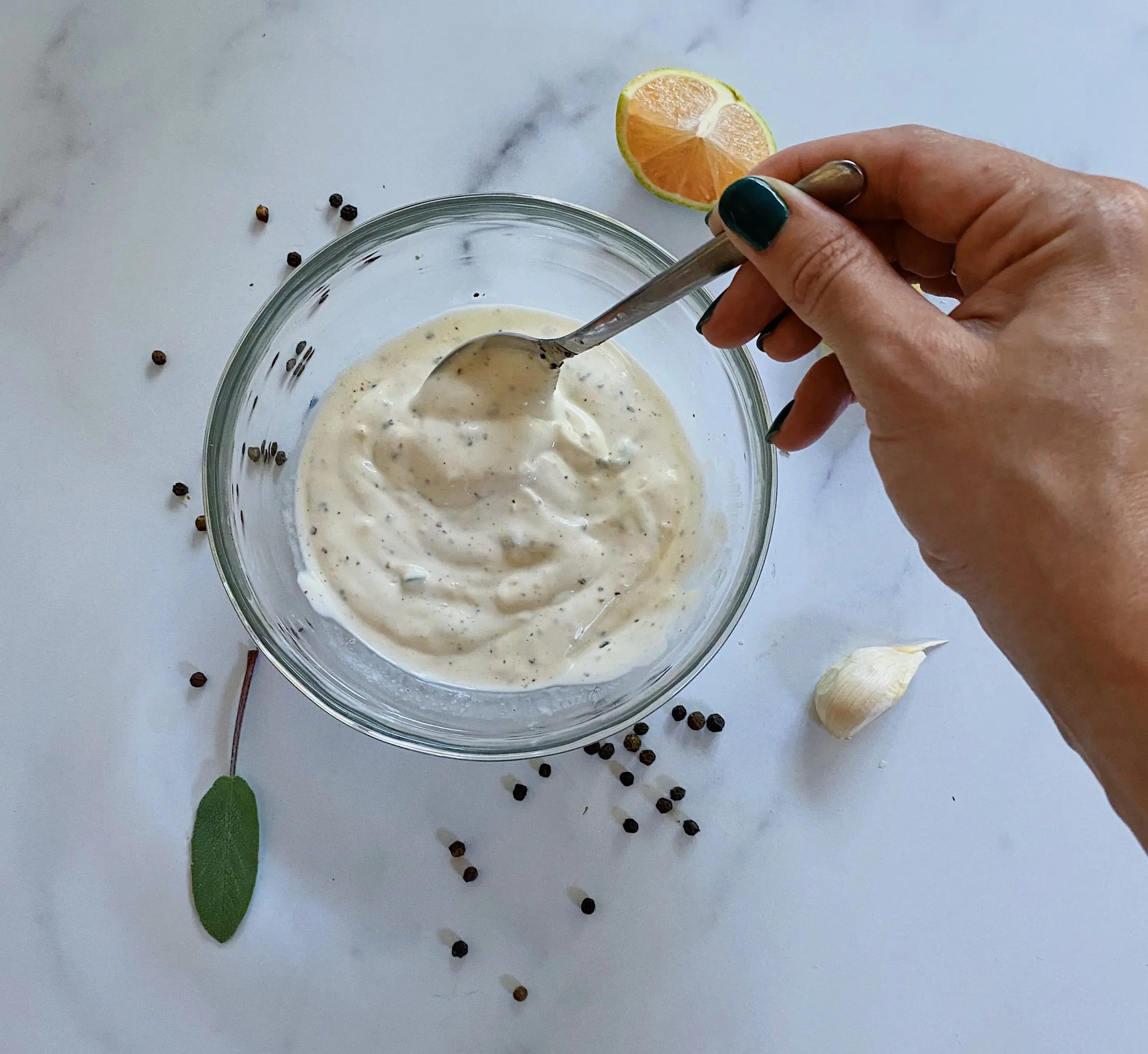 hand mixing aioli in clear bowl with black peppercorns, garlic and sage around it on a marble background