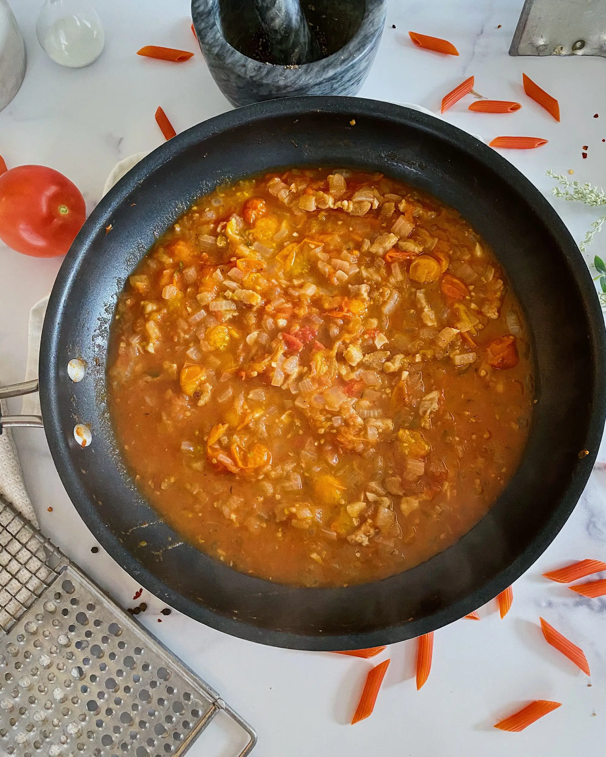 - Add the vodka and reduce by half. Then add your roasted tomatoes + garlic, cherry tomatoes and broth. Stir and break up tomatoes to blend the sauce. Add the fresh herbs and cook for 5 – 10 more minutes, until your cherry tomatoes have burst.